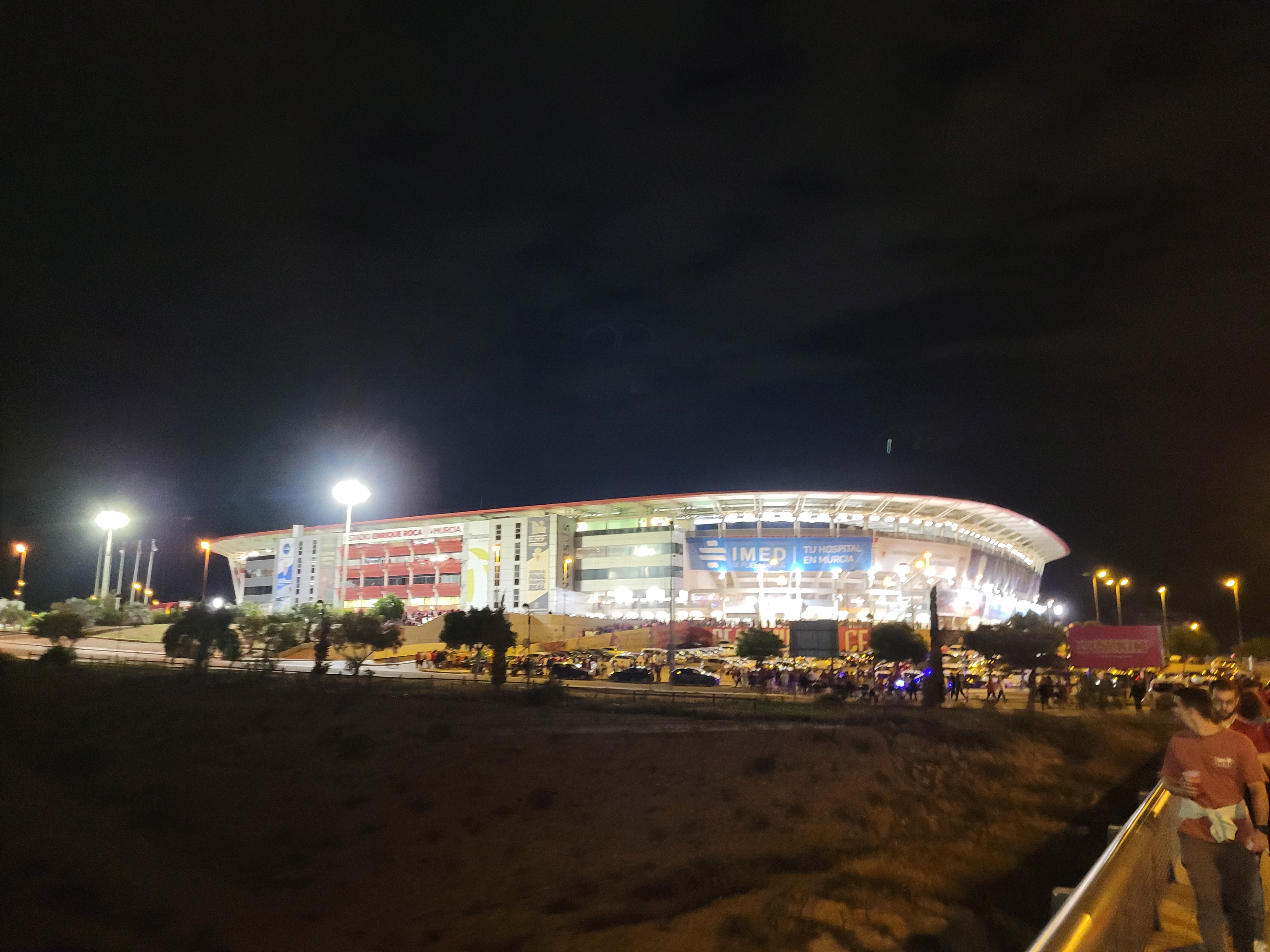 Interimtränaren från andralaget Imperial Murcia, Adrian Colunga ställde en något mer offensiv formation på banan än den i bortamatchen mot Eldense i helgen som gick. Man gick från en 4-5-1-uppställning till en mer klassisk 4-4-2 och båda anfallarna Joao Pedro Palmberg och Ekain Zenitagoia (han som hoppade in och låg bakom poängen senast) var nya i elvan. Till en början fick de dryga 10.000 på läktarna se ett något avvaktande hemmalag som låg djupt och satsade på omställningar. Närmast att göra mål under denna period var Antequera efter en på väg att bli tavla från målvakten som helt missade i ett inlägg från höger men fick se nicken som följde gå utanför. Men det avvaktande spelet började så sakteliga ändra på sig ju längre första halvlek hade spelats. Passningsspelet började sitta och man hittade luckor i Antequeras försvar. Fortfarande får vi dock säga även efter denna holmgång att man har stora problem att producera mål sett till lägena man skapar. Publiken satt konfunderade och undrade hur det inte kunde bli mål av ett inlägg som skapade kalabalik och sedermera ett avslut som gick i stolpen innan det blev offside på returen. Talande för det hela var att 1-0 skulle komma på en straff efter ett misstag av hemmaförsvaret. Straffskytten Ekain Zenitagoia var även han som skapade straffen efter att han stressat motståndaren till en svag hemåtpass, snappat upp bollen och via ett försök att lyfta förbi bollen över mittbacken så tar den på dennes hand. En klar straff, lika klar som avslutet från elva meter - 1-0 strax före pausvilan. Mitt i spelet började det hända saker på läktaren (endast ena långsidan och kortsidorna var öppna för matchen varför bilderna visar en tom långsida), många i publiken reste sig upp för att se vad som hände: På besök var nämligen en av tennisvärldens främsta, Carlos Alcaraz som är från El Palmar i regionen Murcia.