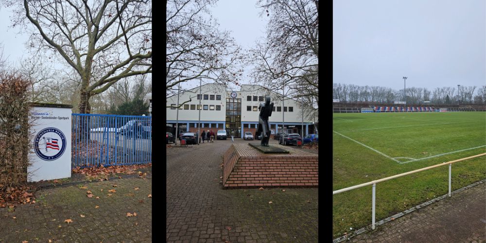 Från vänster: Ingången till arenan - Tasmanias klubbhus - Werner-Seelenbinder-Sportpark huvudplan och läktare.
