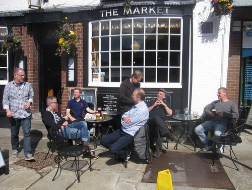 Dagens första pint i Chesterfield inmundigades i solskenet på The Market