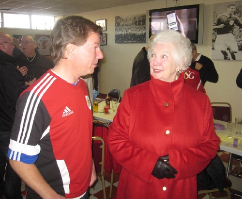 Bristol Citys club president Marina Dolman i samspråk med presidenten för Bristol Citys Svenska Fans sida.