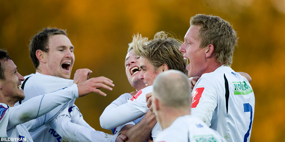 Totte firar efter att han skickat in målet som tog Peking tillbaka till Allsvenskan. Foto: Bildbyrån
