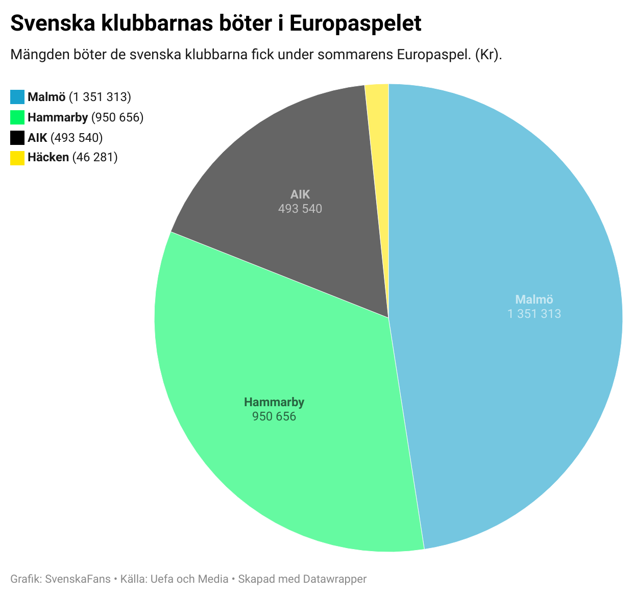 Malmö toppar böteslistan då klubben blev straffad i båda matcherna mot Köpenhamn, och totalt har de fått betala lite över 1,3 miljoner kronor i böter. Klubbarna har bland annat straffats för tändandet av fyrverkeripjäser, kastade föremål och skadegörelse.