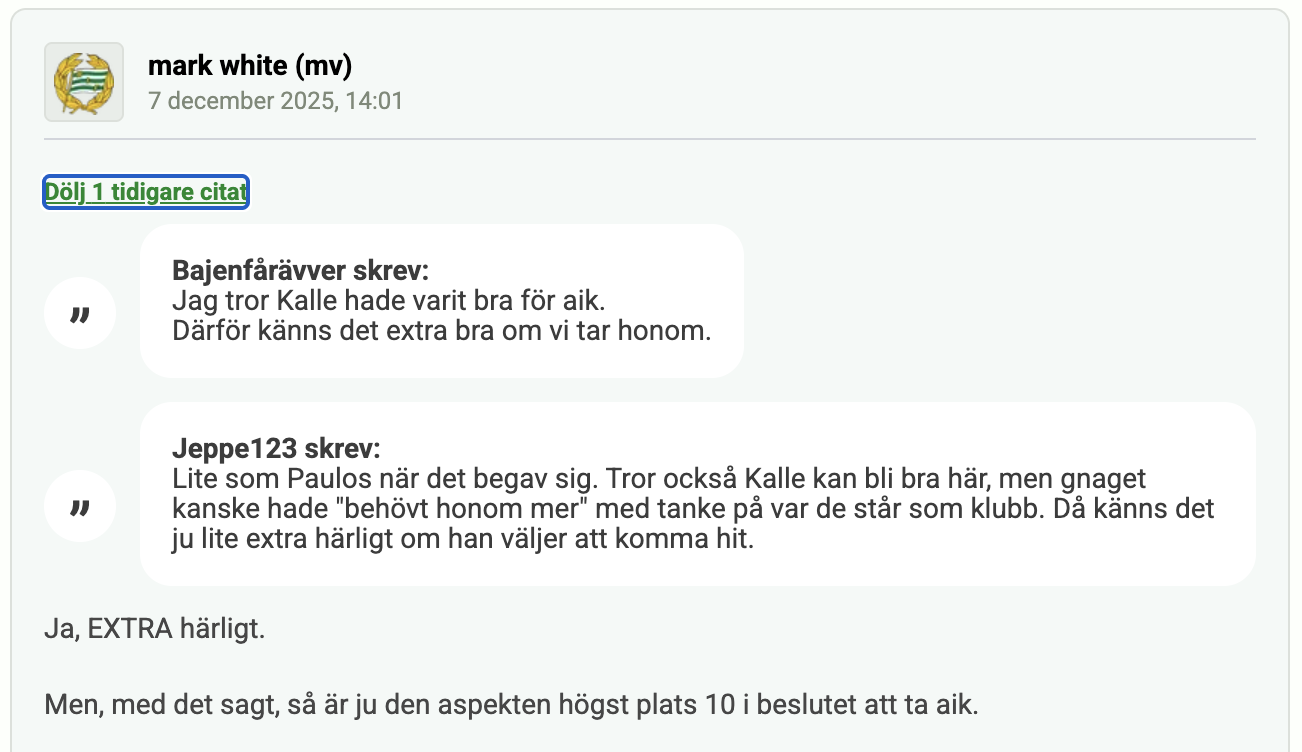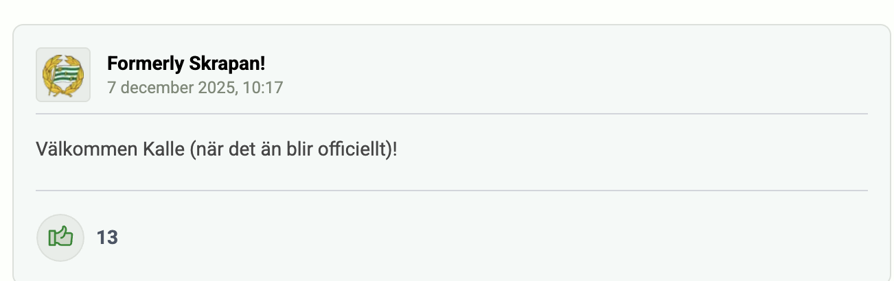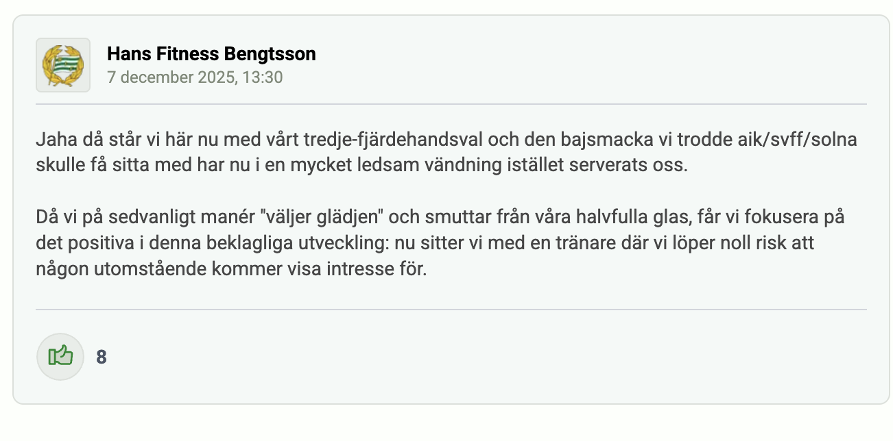 – Jag är försiktigt positiv. Sedan brukar jag envist hävda att fotbollen på den nivå vi här talar om, och egentligen alla nivåer, är ett kollektivt arbete där en man eller kvinna inte skapar hela framgången. Kalle Karlsson kommer till en förening som hela tiden förändras gällande spelartruppens förutsättningar – vi lär knappast står med samma startelva i tävlingspremiären 2026 som vi avslutade 2025 – och han måste dessutom vara rustad att möta yttre kravbilder (inte minst från supporterhåll och gällande medias fokus) som är helt andra än i den relativt anonyma vardagen i Västerås, säger Per.
