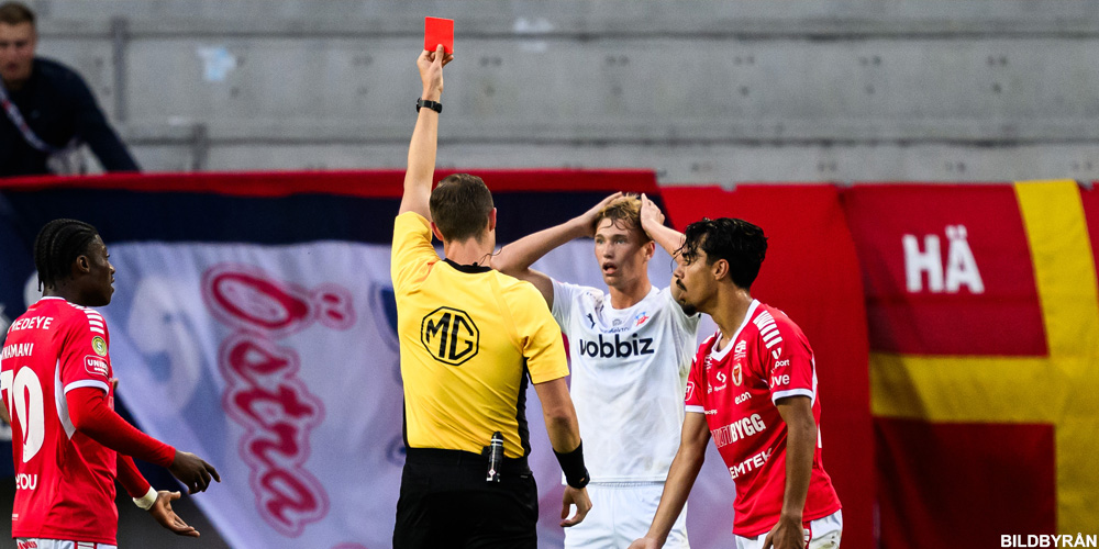 Och så till vår guldmedalj : Helsingborgs Joakim Voelkering Persson . Han drar på sig ett rött kort efter bara sju minuter – korrekt, men väldigt onödigt. Han är värvad för att vara rutinen i backlinjen, men i stället sätter han laget i en omöjlig sits. Helsingborg blir manglade i Borås och förlorar med 0–4 mot Elfsborg.