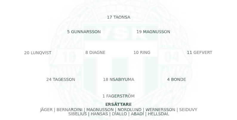 Västerås startade med Fagerström i mål. Tre mittbackar: Nsabiyumva centralt, Tagesson till vänster och Filip Bonde till höger. Wingbacks: Ljungqvist och Gefvert. Centralt Ring och Diagne. Framåt: Magnusson, Gunnarsson och Taonsa.