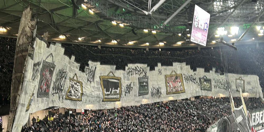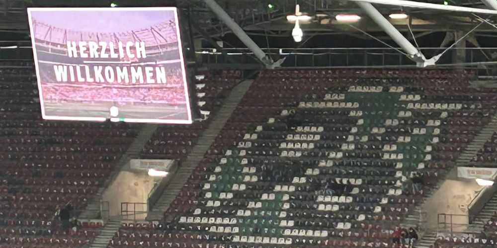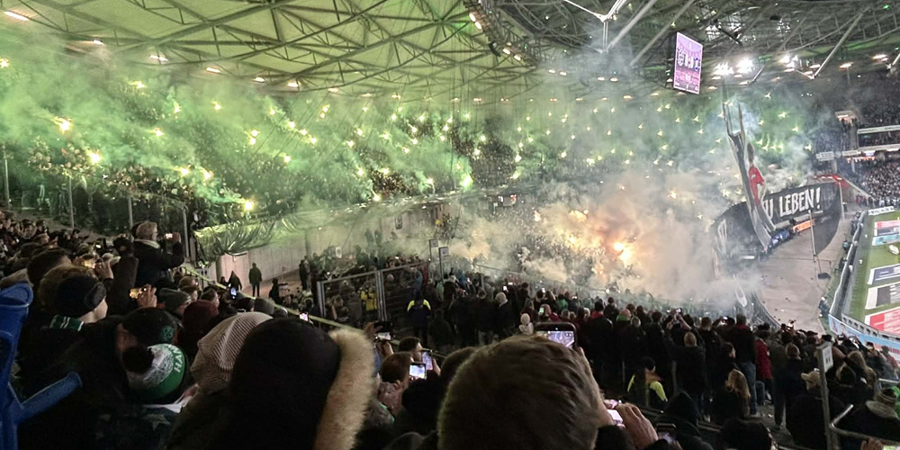 Matchen ? En trevlig utspelning av H96, men det tog tid. först i slutet av matchen kom målen. Alla tre och det var inget snack om saken. Mer imponerande var Hannovers monstruösa ”Choreo”. Först tyst i tolv minuter, sedan dök det upp en stor mäktig banderoll på hela Nordkurve ” Hannovers historia, bilder från klubben”, sedan nästa banderoll ”unser art zu leben” varpå hela kurvan drog igång en pyroteknisk sensation, där hela norra delen av stadion fylldes av grön och vit rök. Mäktigt att se men man missade en hel del av matchen bara genom att se denna pyrotekniska upplevelse. Tänk att pyro kan skötas ändå.