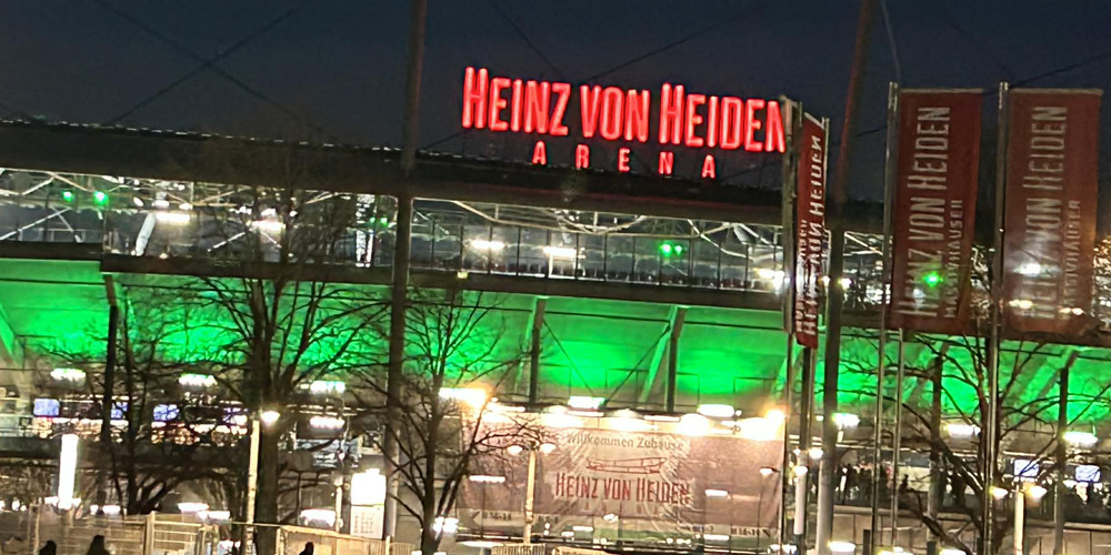 Arenan? Modern sådan, ombyggd efter hand, upplyst i gröna färger med de stora ölhaken, korvstånden, uppsamlingsplatserna och på en liten höjd, som fotbollsarenor skall vara. Folkliv, fans med halsdukar, många med gröna H96 och en del med blå KSC. Fint när fans möts. De pratas vid, dricker någon bärs, äter en wurst och det är skön gemyt. All fotboll bör nog spelas i Tyskland.