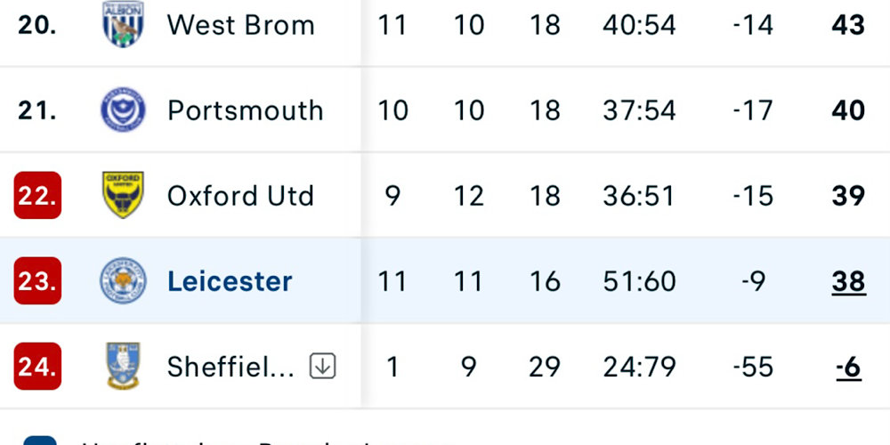 Den 20 april 2025 åkte Leicester ur Premier League igen, efter bara en säsong tillbaka. De förlorade hemma mot Liverpool och stod då på bara 18 poäng efter 33 matcher. Det är redan i sig en katastrof för en klubb som nyss vunnit Championship.