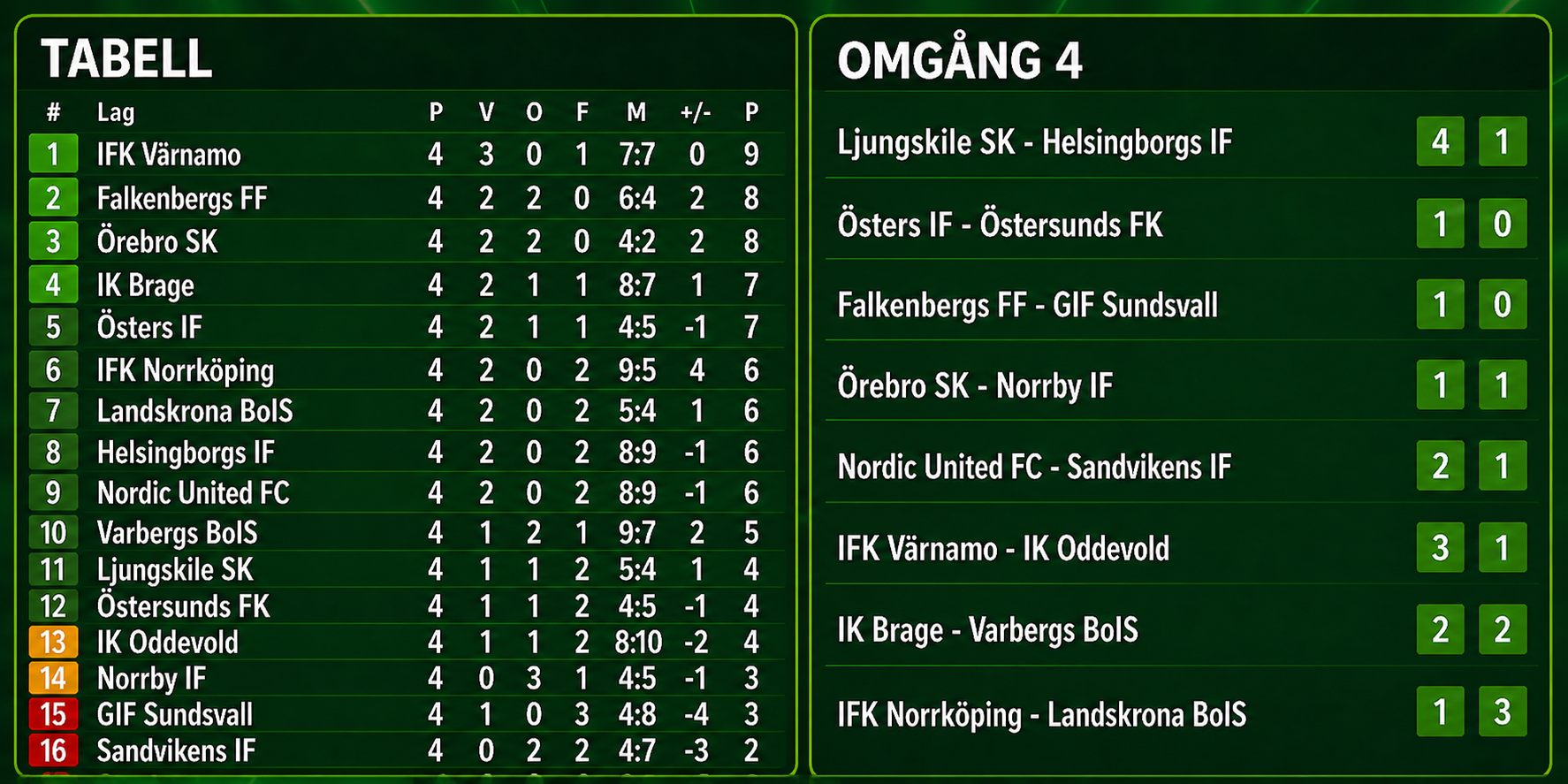Omgång 4 hade nästan allt. Mål, röda kort, vändningar och en riktig tisdagssmäll i Norrköping. Totalt fick vi se 24 mål , och längst upp i serien hittar vi nu Värnamo efter segern mot Oddevold. I andra änden står Sandviken kvar sist, och även om fyra omgångar är tidigt börjar frågan ändå viskas: hur orolig ska man vara, och sitter tränaren Baran Coskun redan lite löst?