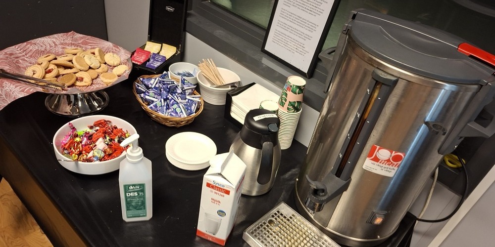 Jag tar en till kaffe i första paus. Där finns också vatten, saft, småkakor och smågodis – sådant som brukar gå åt hos mediafolket.