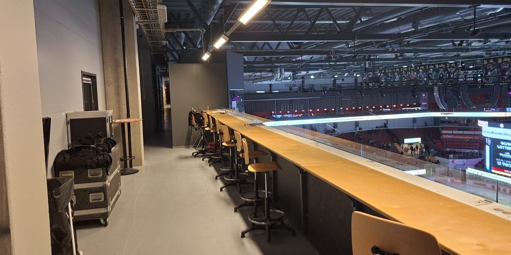 Jag kommer fram till Monitor ERP Arena drygt en timme innan nedsläpp och visar upp min pressackreditering vid entrén. Tar mig upp till pressläktaren som ligger längst upp och som sträcker sig över ena långsidan. Hämtar en kaffe och korv och blickar ut över den tomma isen.